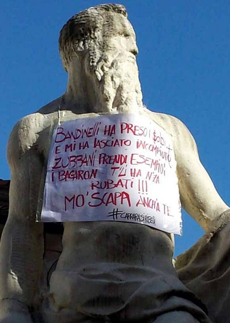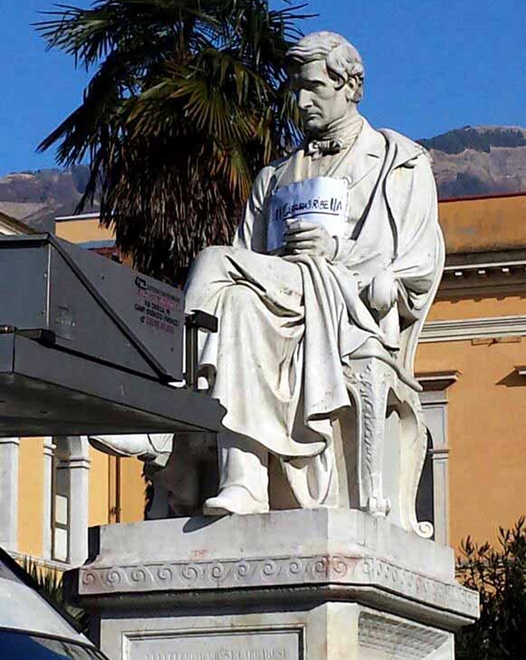 Blitz notturno e anche i monumenti carraresi “si ribellano”: nella notte tra lunedì e martedì su alcune sculture simbolo della città sono apparsi una serie di cartelli esplicitamente ispirati alla protesta dell’Assemblea permanente contro l’amministrazione. E cosi “Il Gigante” di piazza del Duomo, il monumento a Garibaldi nei pressi del teatro degli Animosi, la “Moretta” di Corso Rosselli, il monumento ad Alberto Meschi di Piazza D’Armi e quello a Beatrice D’Este di piazza Alberica -tanto per citarne solo alcuni -sono diventati veicolo della protesta post alluvione contro il sindaco e la giunta, con scritte contro la gestione del lapideo, attacchi al sindaco Zubbani e la sua giunta, chiaramente ispirate agli slogan spesso usati dagli ex-presidianti. Dall’Assemblea permanente non e’ arrivata alcuna conferma sulla “paternita’” dell’inziziativa. L’affissionne non ha danneggiato in alcun modo le opere e i cartelli sono stati fermati con del normalissimo scotch.