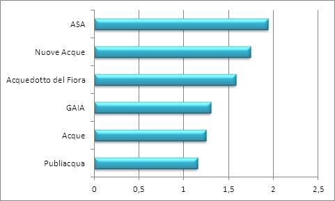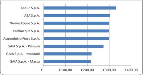 LA TARIFFA – Si riporta la spesa media di un utente di GAIA, simulata pari ad un consumo annuo di 120 mc, ovvero una famiglia media di 3 componenti di tipo domestico residente. La spesa media di un utente di GAIA risulta la più bassa della Toscana.