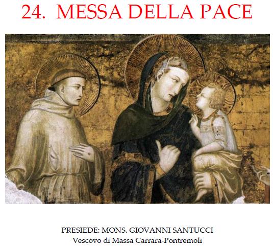 Venerdi, primo giorno dell’anno 2016, alle ore 18.30 in cattedrale, il Centro Francescano Internazionale di Studi per il Dialogo fra i Popoli promuove, nella Giornata Mondiale della Pace, la ventiquattresima MESSA DELLA PACE. Presiede il sacro rito il vescovo diocesano mons. Giovanni Santucci, dirige il coro il M. Giulio Cecconi. Il centro promotore invita tutte le persone che amano la pace ad unirsi per impetrare la pace nel mondo e per ricevere l’antica benedizione tanto amata da san Francesco d’Assisi. Per l’occasione Verranno offerti cento libretti della Messa contenente il Messaggio inviato dal Santo Padre Francesco.