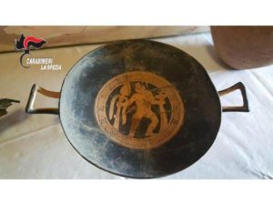 Ci sono anche reperti etruschi tra quelli ritrovati, tra questi una kylix, una coppa larga a due anse usate per bere vino durante i simposi, una padella di bronzo dell’età romana, e poi unguentari, piatti e olette. I reperti erano accuratamente avvolti in giornali di carta datati 1977 e conservati con cura in una valigia nascosta tra la boscaglia dell’area fluviale del Magra a poca distanza dalla zona retroportuale di Santo Stefano Magra. La valigia è stata recuperata la vigilia di Natale dai carabinieri della Compagnia di Sarzana. Il valore artistico archeologico è valutato almeno in centomila euro, ma avrebbe potuto fruttare molto di più una volta immesso nel mercato nero. Gli oggetti, una decina, risalgono nella maggior parte dei casi al secondo e terzo secolo Avanti Cristo, alcuni addirittura al settimo, e sarebbero stati facilmente venduti in maniera illecita, in quanto molto richiesti dal ‘mercato’. I carabinieri, che hanno trovato la valigia durante un controllo antidroga – la zona del ritrovamento è spesso interessata da fenomeni di spaccio -, hanno verificato che tutti gli oggetti non sono provento di furto e ciò fa supporre che fossero nelle disponibilità di tombaroli. I carabinieri non escludendo l’ipotesi del traffico illecito di reperti archeologici. I reperti saranno ora destinati al museo di Luni.