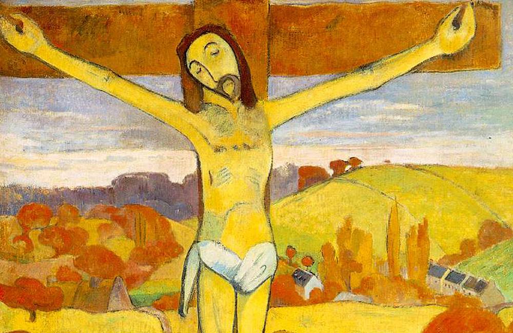 Nella foto “Il Cristo giallo” di Paul Gauguin del 1889, una tela di intenso valore mistico. La scena è dominata da un grande crocifisso, come spesso compaiono nella campagna, sotto il quale tre donne, nei costumi tradizionali bretoni, sono inginocchiate a pregare. Fa da sfondo un paesaggio rurale. La composizione riprende quello della «Crocefissione» comune a tante immagini medievali, dove però al posto del Cristo vi è un crocifisso e al posto della Madonna, e San Giovanni, vi sono delle contadine. Il significato è ben chiaro: rivivere nell’esperienza quotidiana il mistero del sacrificio di Gesù. Il colore giallo assumeme il valore di unione simbolica tra le messi di grano e il Messia.