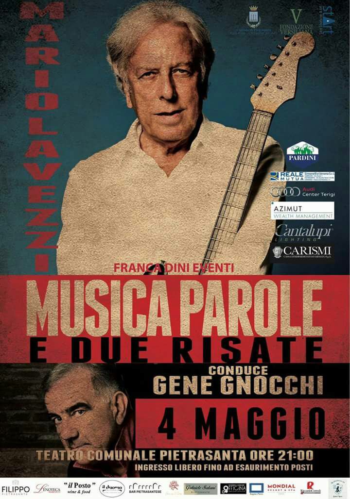 Gene Gnocchi e il grande autore Mario Lavezzi per una serata di canzoni e ricordi, un flash back carico di aneddoti e ironia. Dopo l’incredibile successo delle serate con Bobby Solo e Marco Masini, sul palco del teatro comunale, giovedì 4 maggio alle ore 21.00, è in programma l’ultimo appuntamento con lo show “Musica, parole e… due risate”, evento organizzato e prodotto dall’inesauribile Franca Dini in collaborazione con il Comune di Pietrasanta e la Fondazione Versiliana nell’ambito del progetto StArt – Grandi Eventi.