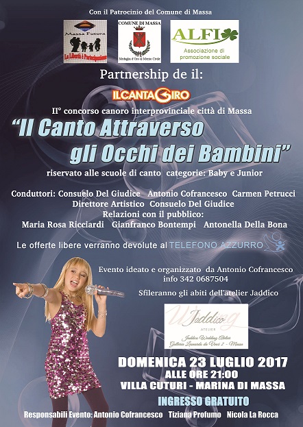 Secondo concorso Canoro Città di Massa ”IL CANTO ATTRAVERSO GLI OCCHI DEI BAMBINI” ideato e organizzato da Antonio Cofrancesco con il Patrocinio del comune di Massa, visto il successo dell’anno scorso il concorso quest’anno avrà 2 serate, 23 luglio e 18 agosto ore 21:00 Villa Cuturi Marina di Massa
