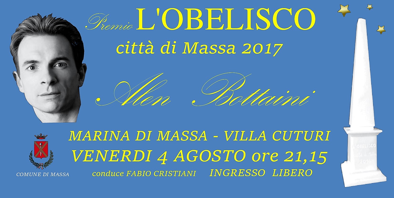 Nella splendida cornice di villa Cuturi a Marina di Massa, venerdi 4 agosto si terrà la quarta edizione del Premio L’Obelisco, un premio, nato da una idea e su iniziativa di Franco Frediani e subito condiviso e patrocinato dall’Amministrazione comunale, che ha come scopo principale quello di esprimere la riconoscenza di un’intera comunità nei confronti di un cittadino che si è particolarmente distinto, in un qualsiasi campo dell’arte, contribuendo così ad illustrare il nome della nostra città. Dopo tre grandi personaggi come Pietro Faleni, autore di “Una rotonda sul mare”,