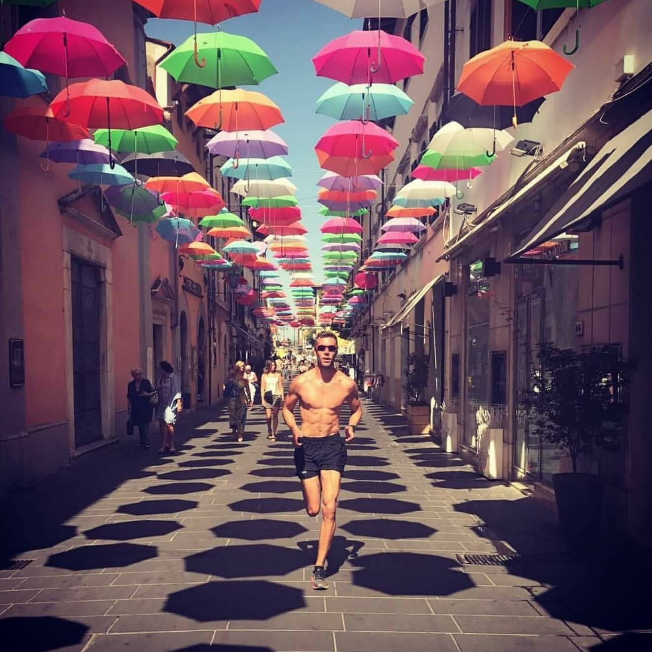 Dai Paesi Bassi alla Piccola Atene, di corsa e a torso nudo sotto gli ombrelli di via Mazzini. Lo scatto dell’atleta olimpionico Robert Lathouwers, che si allena all’ombra del cielo colorato della via di mezzo, spopola in rete e finisce direttamente sulla pagina ufficiale del marchio Asics, sponsor del campione di atletica. Per la strada degli ombrelli volanti di Pietrasanta è la consacrazione, raggiunta a colpi di hashtag su Instragram e a suon di like su Facebook. Il selfie sotto gli ombrelli del centro storico è diventato un must di questa estate caldissima, una mania che ha conquistato residenti e turisti, italiani e stranieri, ma anche vip e sportivi. Da Leonardo Bonucci, protagonista della trattativa di calciomercato più discussa della stagione, per gli ombrelli che fluttuano è stato un successo in continuo crescendo, nato dall’idea del consigliere comunale Daniele Taccola. Un