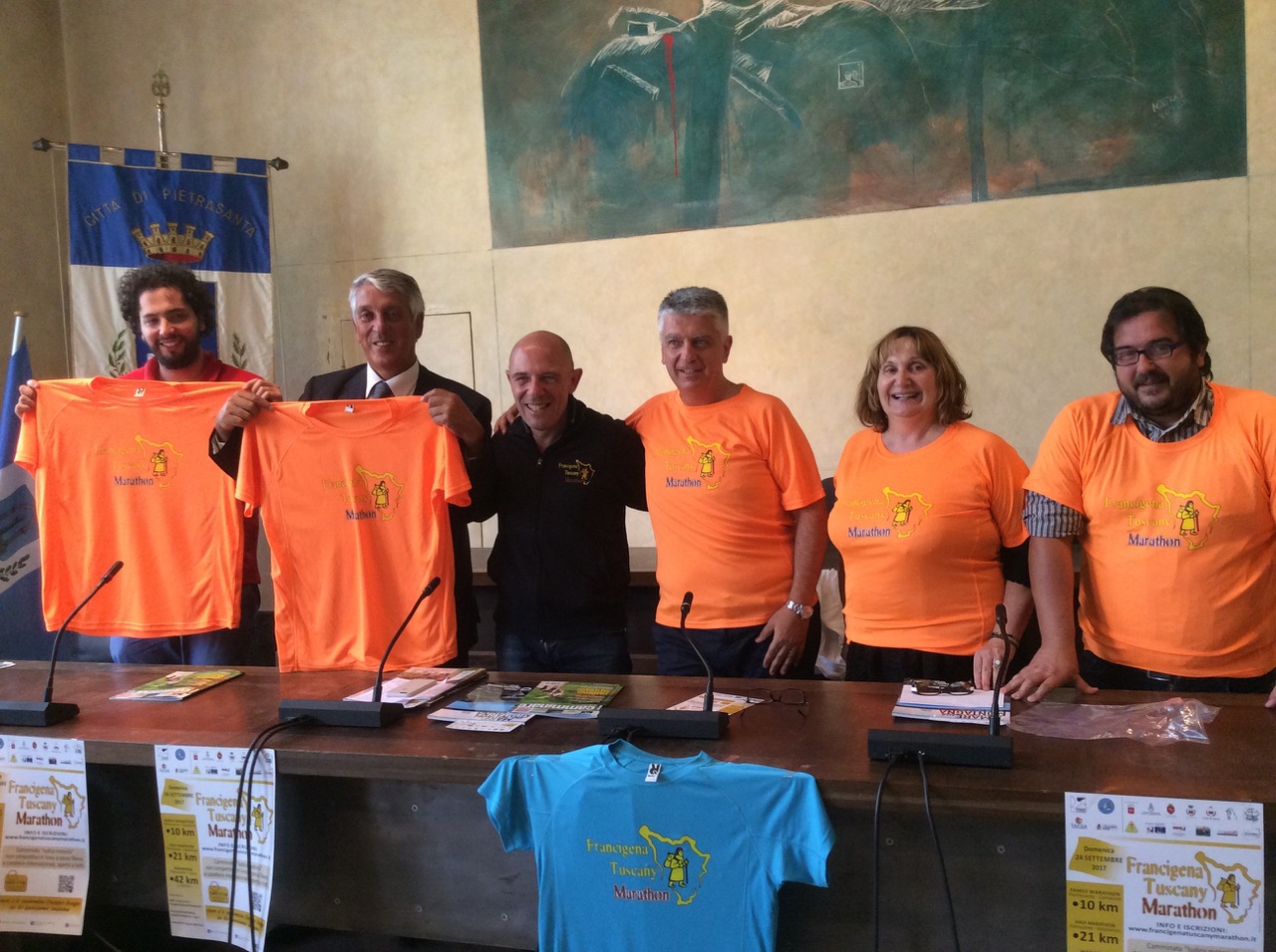 42 chilometri sul tracciato della cristianità da Pietrasanta a Lucca. Partirà da piazza Duomo, cuore della Piccola Atene, la prima edizione della Francigena Tuscany Marathon, un appuntamento che richiamerà 2mila pellegrini, già iscritti alla camminata internazionale, non competitiva e a passo libero. Un grande evento in programma domenica 24 settembre, organizzato dall’amministrazione comunale guidata dal sindaco Massimo Mallegni e dall’associazione Amici della Francigena Pietrasanta, in collaborazione con Arciconfraternita Misericordia Lucca e Lucca Ospitale, con il sostegno della Banca di Credito Cooperativo e di tanti altri sponsor. 1.942 sono i partecipanti, oltre la metà provenienti dalla Toscana, il 58% donne, il 42% uomini. Il percorso sull’antico itinerario di Sigerico prevede anche una Family Marathon da Pietrasanta a Camaiore (10 kilometri) e una Half Marathon da Pietrasanta a Valpromaro (21 km). L’iniziativa è stata presentata nella Sala del Consiglio Comunale dal sindaco Massimo Mallegni e dall’assessore alle Tradizioni Popolari, Lora Santini, referente del progetto. Presenti l’assessore allo Sport, Andrea Cosci, Paola Brizzolari, consigliere comunale con delega alla Cultura e il parroco del Duomo, Monsignor Stefano D’Atri. Tra i promotori della marcia anche il consigliere Daniele Taccola.