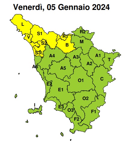 | B – L – R1 – S1 – S2 – S3 – V | IDROGEOLOGICO IDRAULICO RETICOLO MINORE | dalle ore 12.00 Venerdì, 05 Gennaio 2024 alle ore 23.59 Venerdì, 05 Gennaio 2024 | GIALLO |