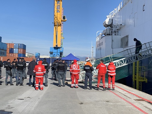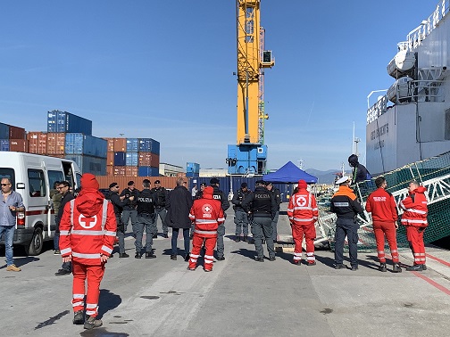Come da protocollo a bordo sono stati effettuati i primi controlli sanitari ad opera degli operatori della sanità marittima insieme a Croce Rossa che ha coordinato le operazioni di sbarco e ha consegnato ad ogni migrante un kit igienico sanitario messo a disposizione grazie alla convenzione tra Croce Rossa italiana e prefettura di Massa Carrara (modello di riferimento a livello nazionale).