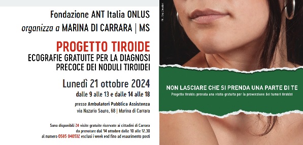 La giornata, si terrà sabato 21 ottobre 2024 presso gli ambulatori della Pubblica Assistenza a Marina di Carrara Via Nazario Sauro 68 , dalle ore 09.30 alle 13.30 e dalle 14.00 alle 18.00. Per accedere alle visite è obbligatoria la prenotazione telefonica, telefonando il 14 ottobre alla sede ANT 0585 040532 dalle ore 10.00 alle 12.30 fino ad esaurimento posti.