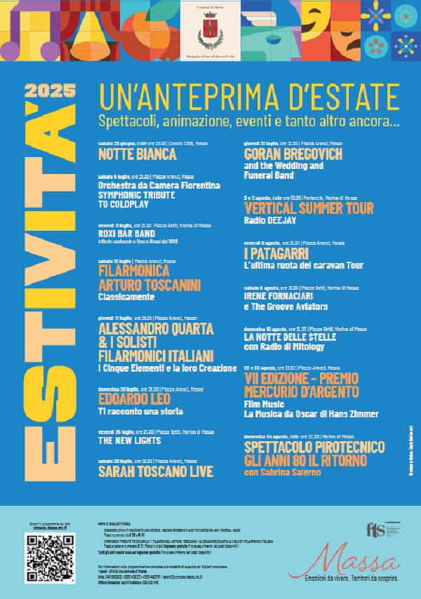Sarà un’estate all’insegna dell’emozione, della cultura e della condivisione quella che si prepara ad accogliere cittadini e visitatori a Massa. L’Amministrazione comunale ha ufficialmente presentato il calendario di Estività 2025, la rassegna che, da giugno a settembre, trasformerà la città e le sue frazioni in un palcoscenico a cielo aperto.
