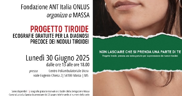 La giornata, si terrà lunedì 30 giugno 2025 presso il Centro Poliambulatoriale Dicra Viale Eugenio Chiesa 2 Massa , dalle ore 13.00 alle 17.00. Per accedere alle visite è obbligatoria la prenotazione telefonica, telefonando il 23 giugno 2025 alla sede ANT 0585 040532 dalle ore 10.00 alle 12.30 fino ad esaurimento posti.