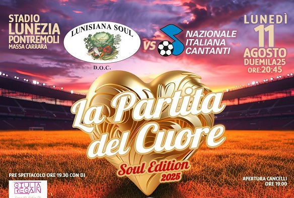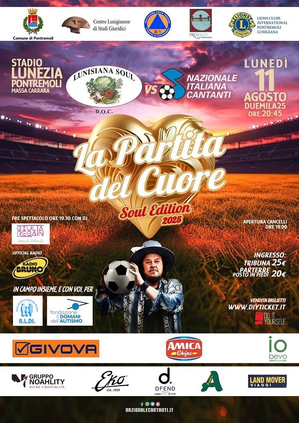 Lunedì 11 agosto alle 20.45 va in scena la “Partita del Cuore”, sfida benefica tra Lunisiana Soul, la squadra capitanata da Zucchero Fornaciari, e la Nazionale Cantanti, con l’obiettivo di raccogliere fondi a favore dell’Associazione Lunigianese Disabili (Aldi) e della Fondazione Il Domani dell’Autismo.