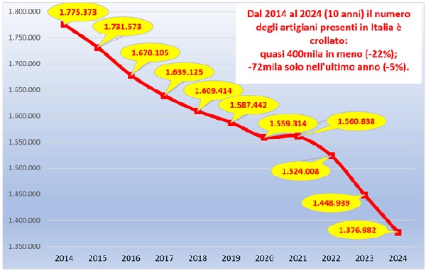 Pertanto, possiamo affermare con grande preoccupazione che in due lustri quasi un artigiano su quattro ha gettato la spugna. Anche nell’ultimo anno la contrazione è stata importante: tra il 2024 e il 2023 il numero è sceso di 72mila unità (-5 per cento). La riduzione ha interessato tutte le regioni d’Italia, nessuna esclusa. Nell’ultimo decennio le aree più colpite da questa “emorragia” sono state le Marche (-28,1 per cento), l’Umbria (-26,9), l’Abruzzo (- 26,8) e il Piemonte (-26). Il Mezzogiorno, invece, è stata la ripartizione geografica che ha subito le “perdite” più contenute. Grazie, in particolare, agli investimenti nelle opere pubbliche legati al PNRR e agli effetti positivi derivanti dal Superbonus 110 per cento, il comparto casa ha “frenato” la caduta del numero complessivo degli artigiani di questa ripartizione geografica. La denuncia è sollevata dall’Ufficio studi della CGIA che ha elaborato i dati dell’INPS e, per quanto concerne il numero delle imprese artigiane attive, di Infocamere/Movimprese.