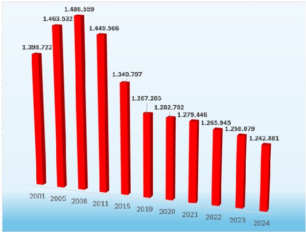 | ITALIA | 1.775.373 | 1.448.939 | 1.376.982 | -398.391 | -22,4 | -71.957 | -5,0 | |