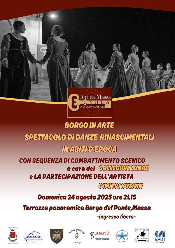 Un tuffo nella magia del Rinascimento, tra coreografie eleganti, duelli scenici e suggestioni artistiche. È quanto propone l’Associazione Antica Massa Cybea con la serata in programma domenica 24 agosto, alle 21.15, nella terrazza panoramica oltre l’Arco dei Genovesi Rosso Cybea, adiacente alla chiesa.