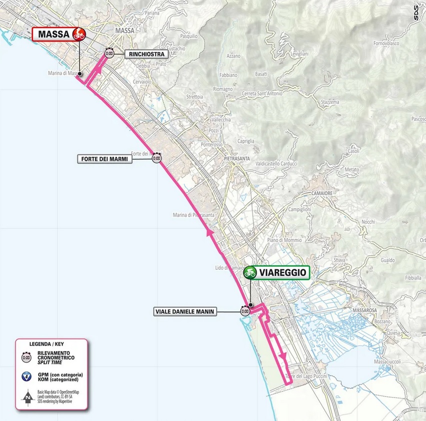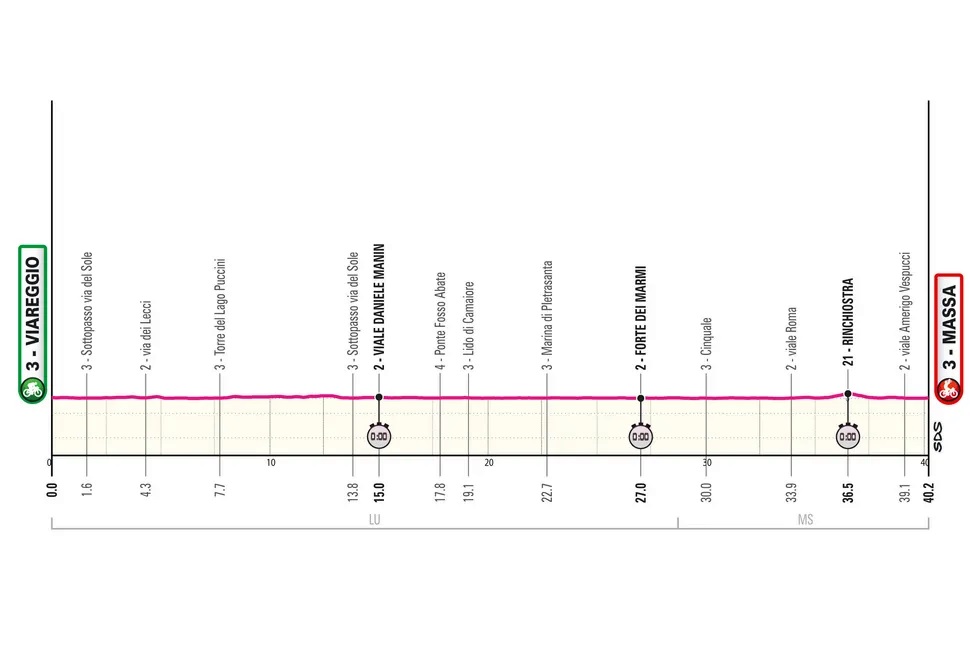 Una delle novità che interessano da vicino la Toscana e la zona apuana riguarda la decima tappa: il 19 maggio 2026 è infatti in calendario una cronometro individuale di circa 40,2 km con partenza da Viareggio e arrivo in Viale Vespucci a Marina di Massa