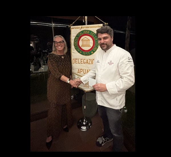 Tornando alla serata, la Delegata ha tenuto a dire che lo chef Devoto, di origini sarzanesi, «avendo respirato da sempre all’interno della sua famiglia emiliana profumi e sapori della cucina ha acquisito la capacità di rendere la cucina straordinaria. Allievo di Paracucchi, uno dei maestri della gastronomia italiana, dopo esperienze in Valle d’Aosta e a Sarzana, nel 2021 ha rilevato la Locanda de Banchieri, un casale del Seicento dove ha messo a frutto le sue idee, fra le quali quella di una produzione a centimetri zero, poiché riesce a portare in tavola profumi e sapori che arrivano per il settanta per cento dai prodotti coltivati nei quarantamila metri quadrati adiacenti il casale. Ha raggiunto l’obiettivo che si era proposto :unire sostenibilità, tradizione e innovazione. Il giovane chef e la locanda sono stati la prima realtà lunigianese a ricevere, nel 2025, la stella Michelin, confermata per il 2026».