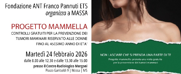 Le visite nell’ambito del” Progetto Mammella ANT” per la prevenzione dei tumori della mammella saranno effettuate presso lo Studio Radiologico Mergoni, piazza Garibaldi 9/3, Massa 54100.