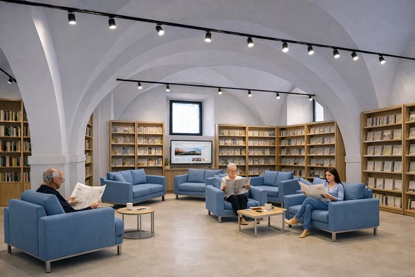 L’intervento prevede l’accesso anche da piazza Accademia, per favorire al massimo la permeabilità con il centro storico, qui si troverà l’emeroteca, organizzata con sedute comode ed accoglienti per circa 20 persone ed una consistente parte del magazzino di libri, sempre a questo piano sarà il Front Office. Al piano terra inoltre è prevista la sistemazione della sezione bambini, acusticamente isolata e connessa ad una ambiente che sarà destinato a fasciatoio e sala allattamento per le mamme con figli piccoli.