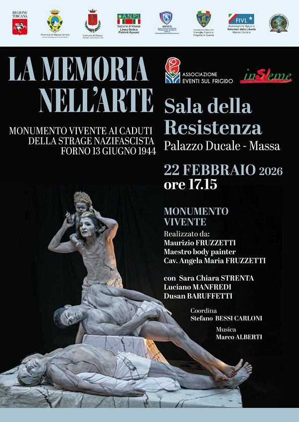 Monumento vivente ai caduti di Forno: dopo il successo ottenuto con la realizzazione del monumento in carne ed ossa, in memoria dell’eccidio nazifascista del 13 giugno 1944, le associazioni Insieme ed Eventi sul Frigido propongono un incontro a Palazzo Ducale, nella Sala della Resistenza, per spiegare l’evento, proiettare tutte le immagini della serata del 22 agosto e soprattutto per presentare il calendario 2026 realizzato con alcune delle foto più belle scattate da Walter Sgadò.
