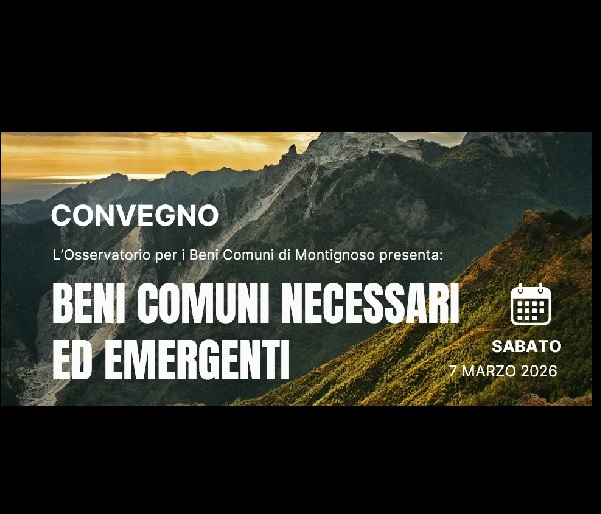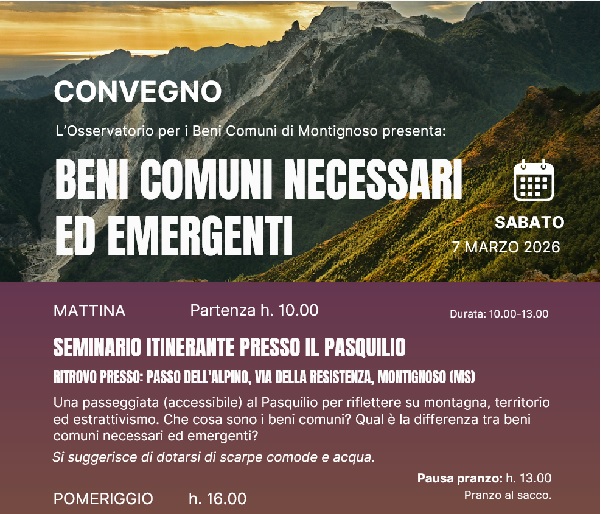 Il pomeriggio, a partire dalle ore 16.00 presso Villa Schiff, si terrà il convegno “La prospettiva dei beni comuni”, con la partecipazione di docenti universitari, studiose e studiosi di diritto, filosofia politica, antropologia e storia dell’ambiente, insieme a ospiti internazionali interessati al caso di Montignoso. Sarà un momento aperto di approfondimento e confronto pubblico, in cui sarà possibile porre domande e contribuire alla discussione.