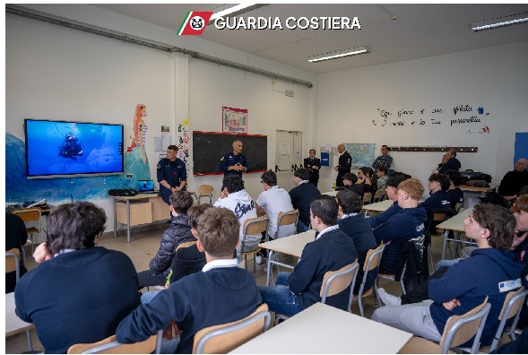 Il confronto è proseguito all’Istituto Nautico “M. Fiorillo”, dove il legame tra formazione e professione è stato accompagnato dal ricordo della Medaglia d’Oro Michele Fiorillo, nel 60° anniversario della sua scomparsa. Questa memoria ha fatto da sfondo all’incontro tra gli studenti e le donne e gli uomini della Guardia Costiera, intervenuti nell’occasione anche con le testimonianze portate dagli operatori del 5° Nucleo subacquei di Genova.